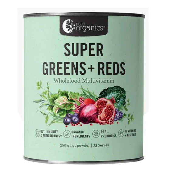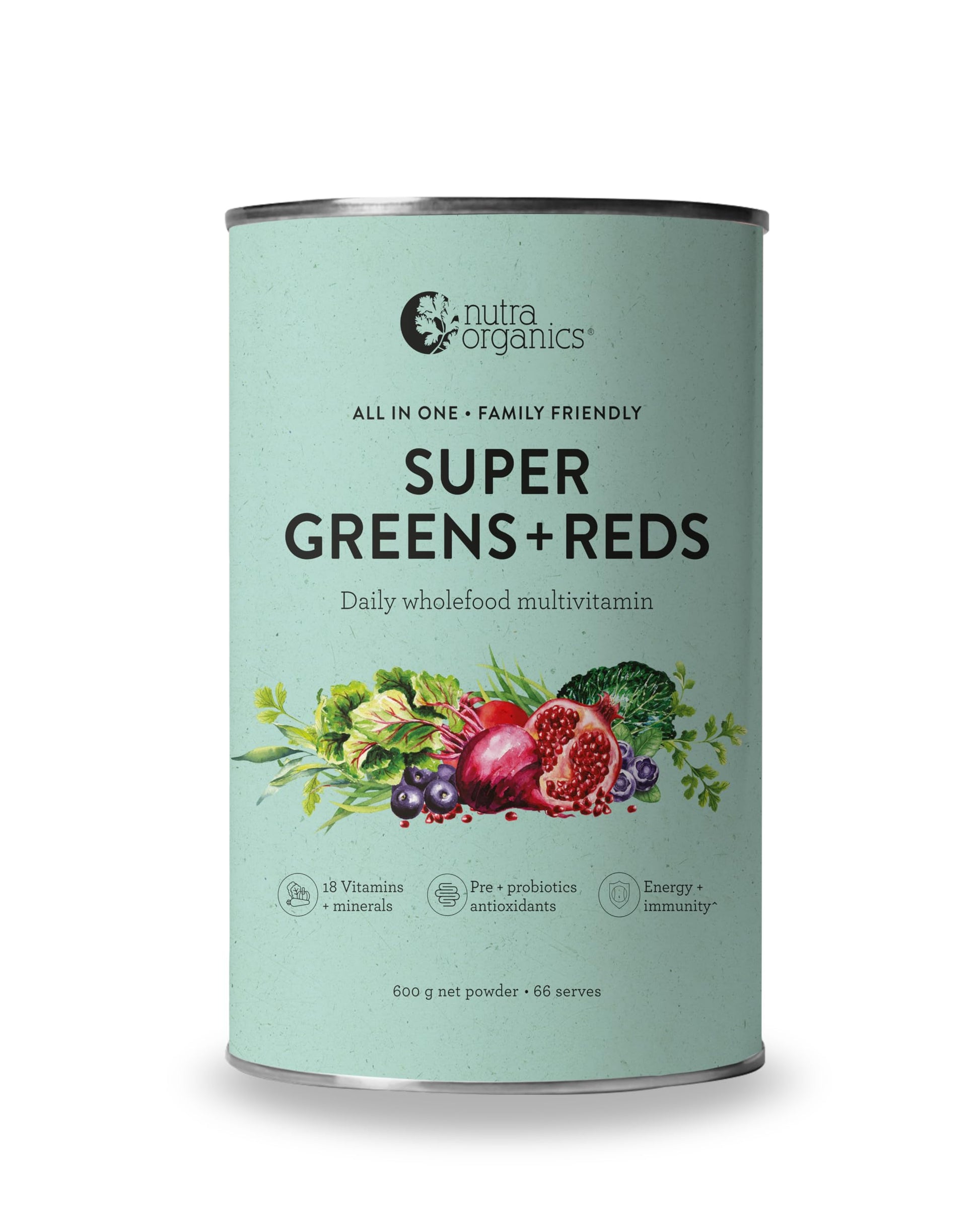 Plus, with a synbiotic blend containing prebiotics and probiotics to support digestive health^, plant protein and a restorative & cleansing herbal blend, Super Greens + Reds is the most comprehensive, potent & bioavailable multivitamin formula using only natural wholefood sources.